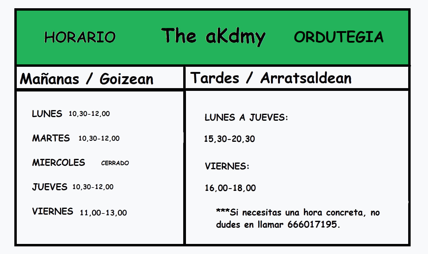 Nos encontramos en 8 Carr Zorroza-Castrejana, un lugar accesible y bien comunicado. Puedes visitarnos en cualquier momento dentro de nuestro horario para resolver dudas o conocer más sobre nuestros cursos. ¡Te esperamos!